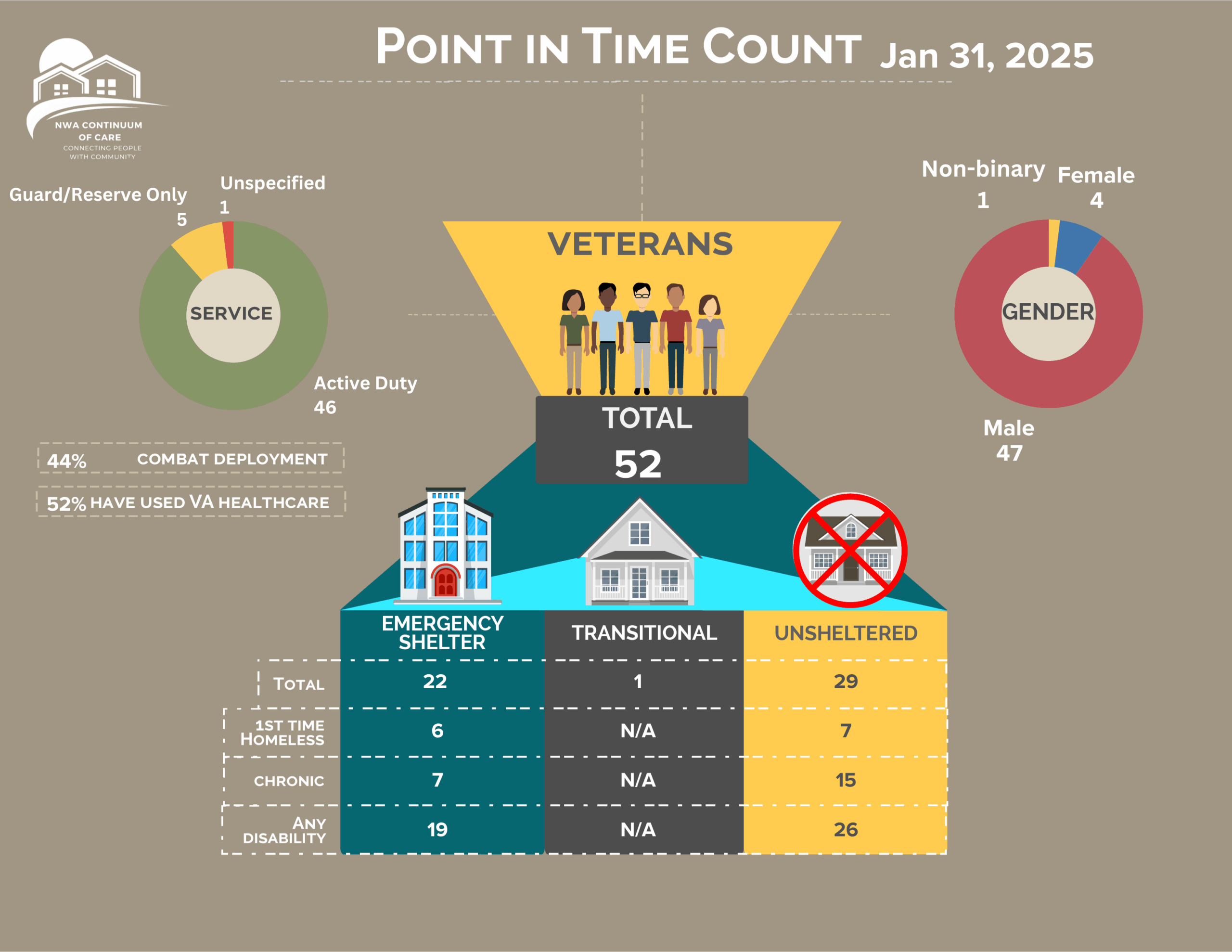 Breakdown of Veterans that are experiencing homelessness in NWA.
